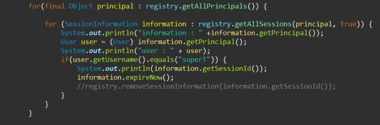 @Autowired로 주입된 registry(SessionRegistry)객체를 아래와 같은 방법으로 원하는 세션을 만료시킨다