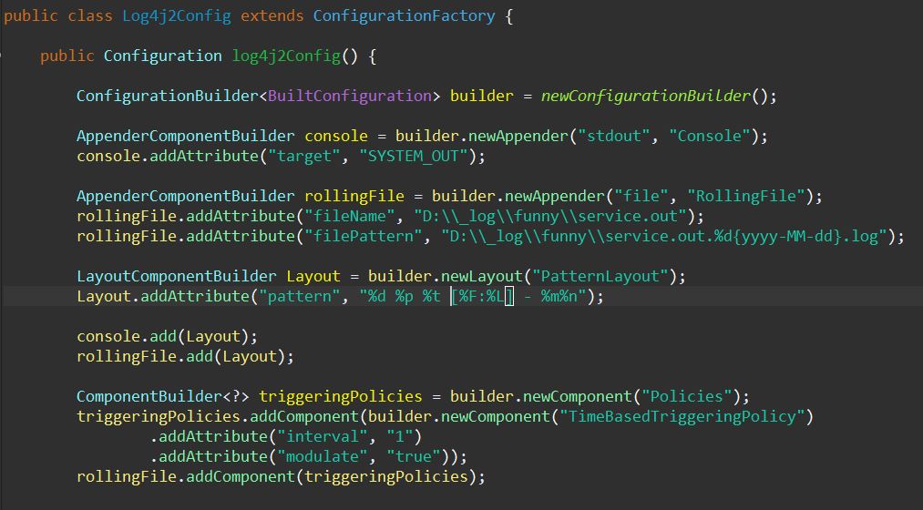 Builder로 롤링할 주기나 사이즈 등의 규칙을 Component로 구성한 후 원하는 appender에 추가한다